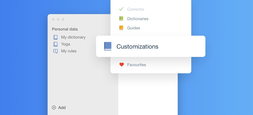 To open the customizations window from the corrector, click the settings icon () in the toolbar and select Customizations from the drop-down menu.