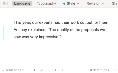 Antidote can help you quickly spot and bypass passages of text written in a language other than English by displaying a vertical blue bar in the left-hand margin of the correction panel anywhere text written in French occurs and a grey bar where text written in some other language occurs. Antidote displays the percentage of the text that is written in English and the percentage in French in the status bar below the correction panel.