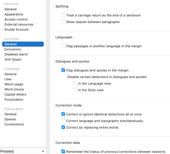 Dialogues and quotes often possess particular attributes that you may wish to leave intact. You can instruct the corrector not to flag certain errors in these passages. If necessary, specify whether these errors are to be ignored in the Language or Style views.