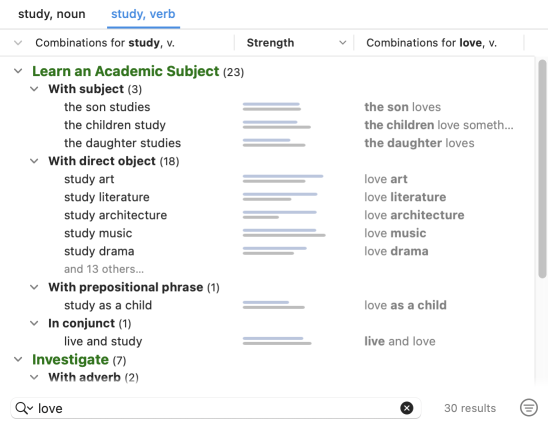 A blue bar opposite each combination shows its relative statistical strength: the longer the bar, the stronger the combination in comparison with the other combinations in the same context. The strength depends on a combination’s frequency, but also on the uniqueness of the association between the terms.