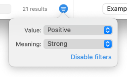 Click the button to filter the list of combinations based on their connotation (positive or negative) or meaning (strong or weak). These filters help you choose the combinations that are most likely to meet your criteria by shortening the list of options. To return to the original display, click the button again and then click Disable filters.