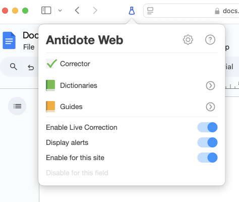 Select the text you want to correct or the word you want to look up, then click the flask icon in the toolbar to launch Antidote’s tools. Cick the next to the tool icons to select a specific resource.