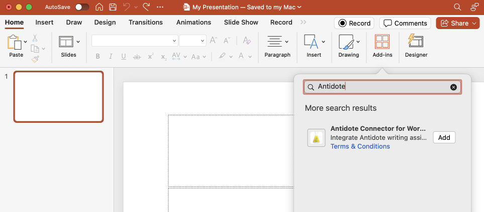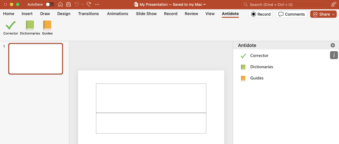 - The Antidote Connector works with PowerPoint 2024 or a Microsoft 365 subscription.