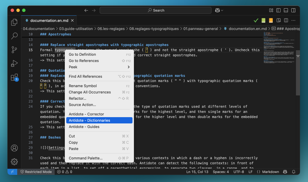 To access Antidote, place the cursor at the desired location in the document, then call Antidote’s resources using the buttons in the context menu.