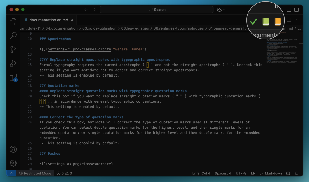 To access Antidote, place the cursor at the desired location in the document, then call Antidote’s resources using the buttons in the toolbar.