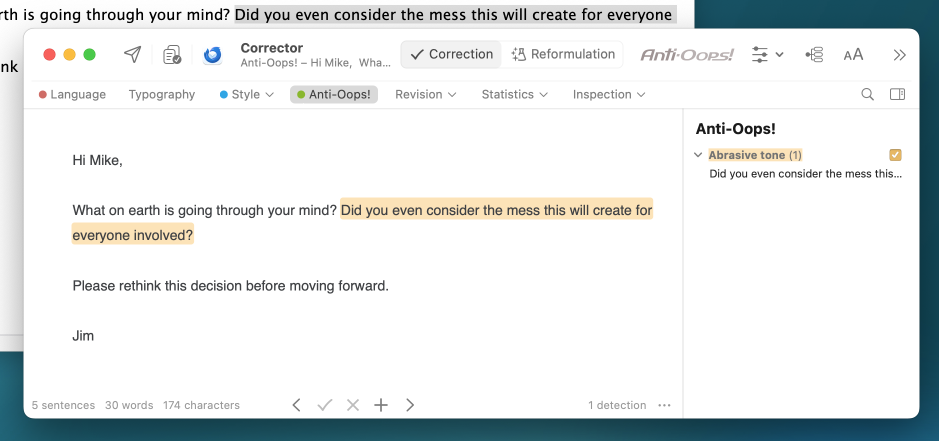 Anti-Oops! checks your email when you click Send. If your message contains errors or an abrasive tone that might be ill received by the recipient, the corrector opens automatically. Anti-Oops! also flags missing attachments.