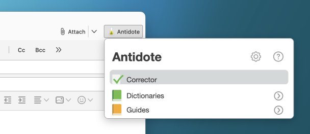 While writing an email, select the text you want to correct or the word you want to look up, click Antidote’s flask icon in the toolbar, then select the tool you want to use from the context menu. Click the next to the tool icons to select a specific resource.