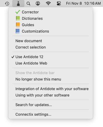 You can use this menu to launch Antidote from any application you are writing in. If Antidote integrates with the software in question, any changes you make in the corrector will be applied automatically to the source text. Otherwise, you need to copy the corrected text and paste it back into the original document.