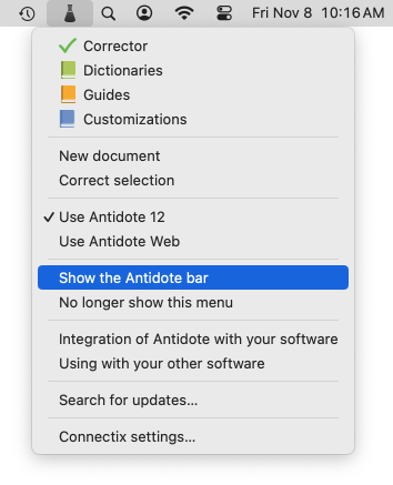 If you close the toolbar, you can restore it by clicking the Antidote Agent and selecting Show the Antidote bar.