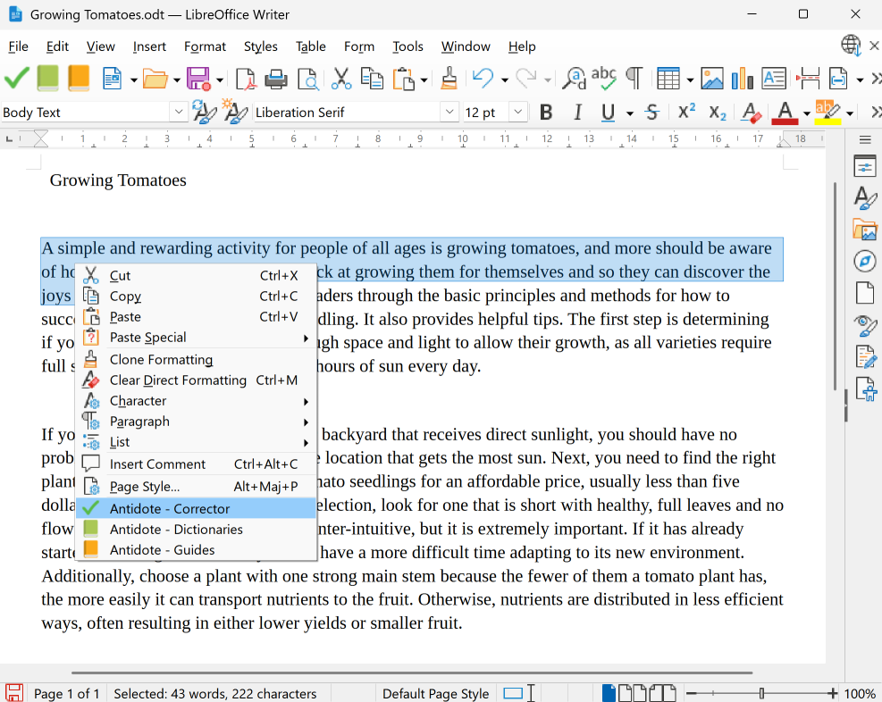 Select the text you want to correct or the word you want to look up, then right-click to display a context menu from which you can choose the Antidote tool you want to launch.