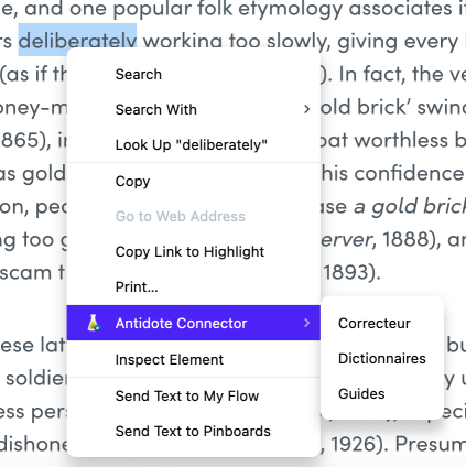 Select the text you want to correct or the word you want to look up, click Antidote’s flask icon in the browser’s toolbar, then select the tool you want to use from the context menu. Click the next to the tool icons to select a specific resource.