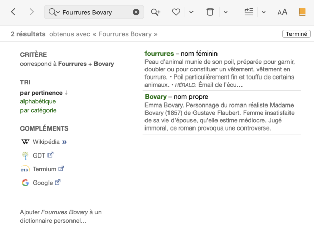 Un lien similaire s’affiche dans le panneau principal du dictionnaire de définitions quand vous entrez en vedette un mot qui figure déjà dans un de vos dictionnaires personnels. Au besoin, cliquez sur le lien pour changer la catégorie du mot, augmenter ou corriger sa définition, revoir ses caractéristiques, etc.