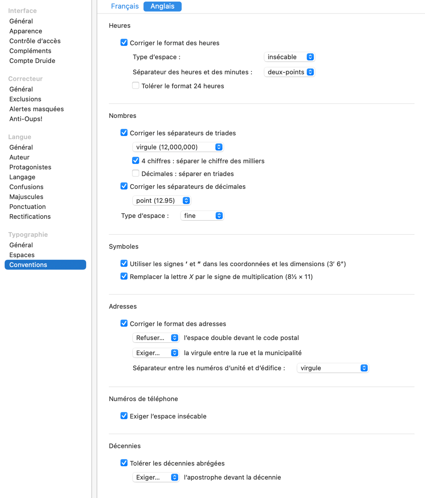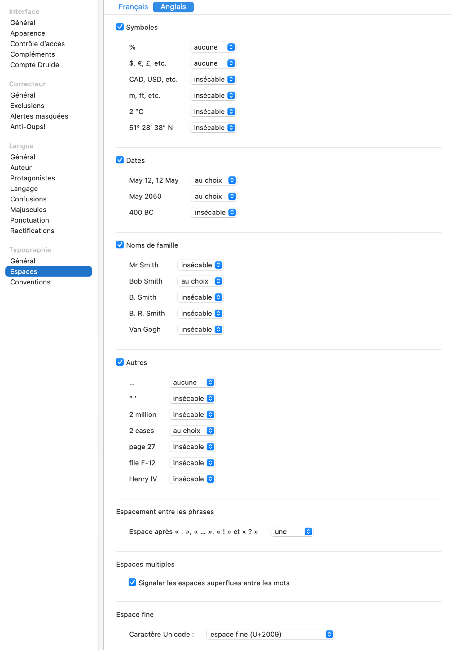 Les réglages suivants sont par ailleurs propres à la correction de l’anglais.