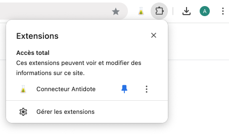 Astuce — Pour vous assurer que la fiole figure toujours dans la barre d’outils, épinglez-la en cliquant sur l’icône des extensions de Chrome (1), puis sur le symbole de punaise (2).