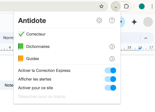 L’option Poursuivre dans Antidote 12 ou Poursuivre dans Antidote Web vous est proposée au survol de la souris sur l’icône de la fiole. Cette commande ouvre une fenêtre du correcteur Antidote. Un clic sur l’icône exécute aussi cette commande.