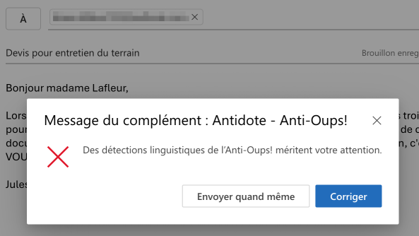 L’Anti-Oups! vérifie votre courriel automatiquement au moment où vous cliquez sur Envoyer. Une fenêtre vous invite à ouvrir le correcteur d’Antidote si votre courriel contient des erreurs ou des passages au ton vexant qui pourraient froisser la personne qui lira le message. L’Anti-Oups! signale aussi les pièces jointes manquantes.